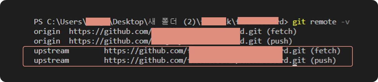 4. 원격저장소 추가(git remote -v로 확인. origin만 존재할 것이다.) 여기서 ex)git add remote upstream url명령어를 활용해 추가함.