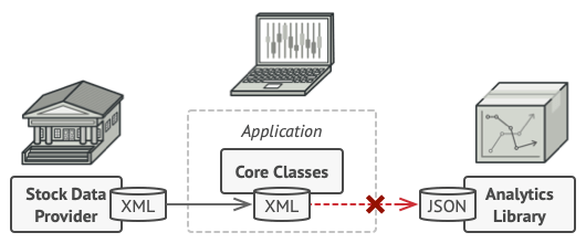 주식 시장 앱으로 돌아가 보겠습니다. 호환되지 않는 형식의 딜레마를 해결하기 위해 코드가 직접 작동하는 분석 라이브러리의 모든 클래스에 대해 XML-JSON 어댑터를 만들 수 있습니다. 그런 다음 이러한 어댑터를 통해서만 라이브러리와 통신하도록 코드를 조정합니다. 어댑터가 호출을 받으면 들어오는 XML 데이터를 JSON 구조로 변환하고 호출을 래핑된 분석 개체의 적절한 메서드로 전달합니다.